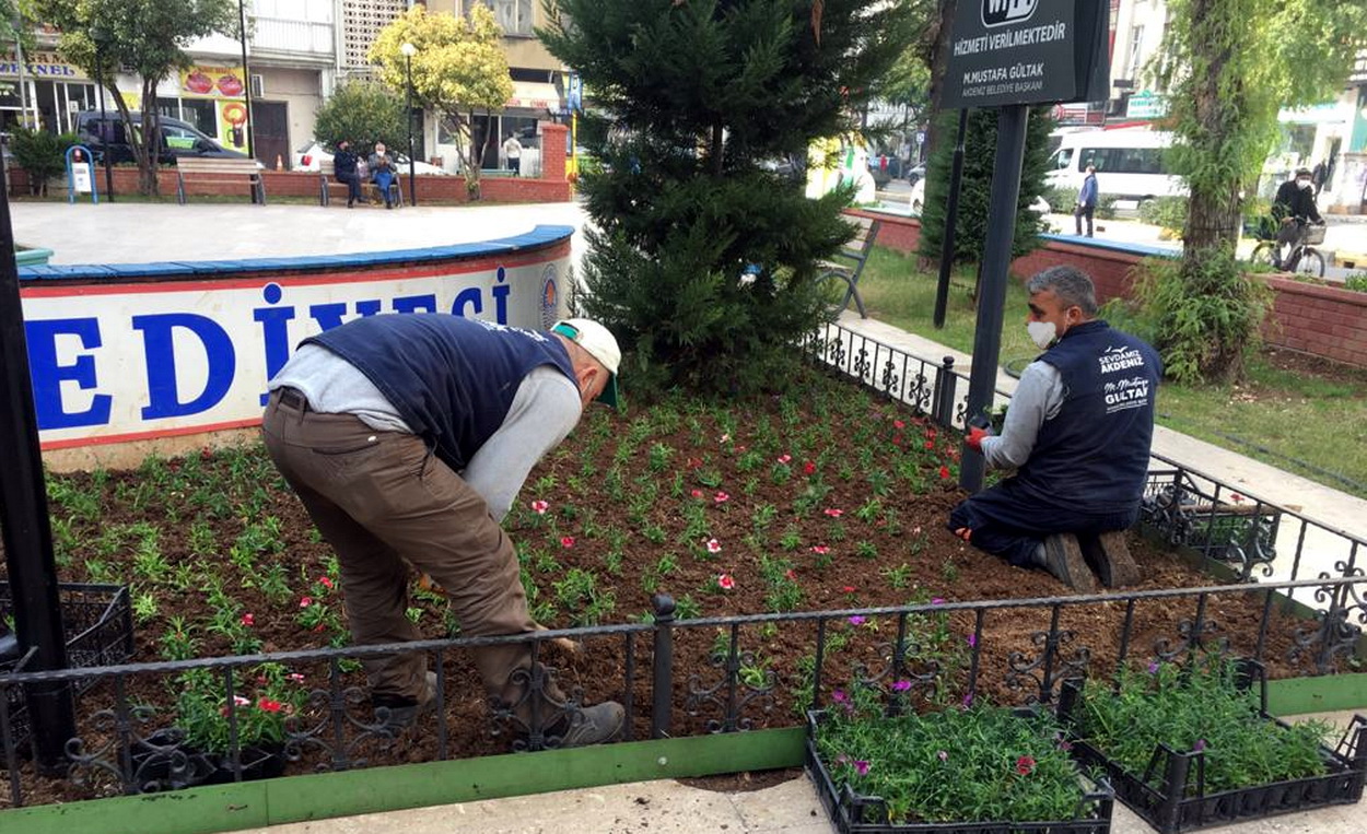 Hava koşullarının uygun olduğu günlerde, Akdeniz’in park ve yeşil alanlarına mevsimlik çiçek ekim çalışması da yapan park ve bahçeler müdürlüğü ekipleri, son olarak Özgür Çocuk Parkı’na yüzlerce mevsimlik çiçek dikti, her gün yüzlerce insanın uğradığı parkın görünümünü baştan sona değiştirdi. Kuvvai Milliye Caddesi Kuruçeşme Durağı civarına da banklar ve çöp kovalarının montajını yapan ekipler; Çevre 2000, Çınar ve Menekşe parklarının içinde bulunan çöp kovalarını da yeniledi.