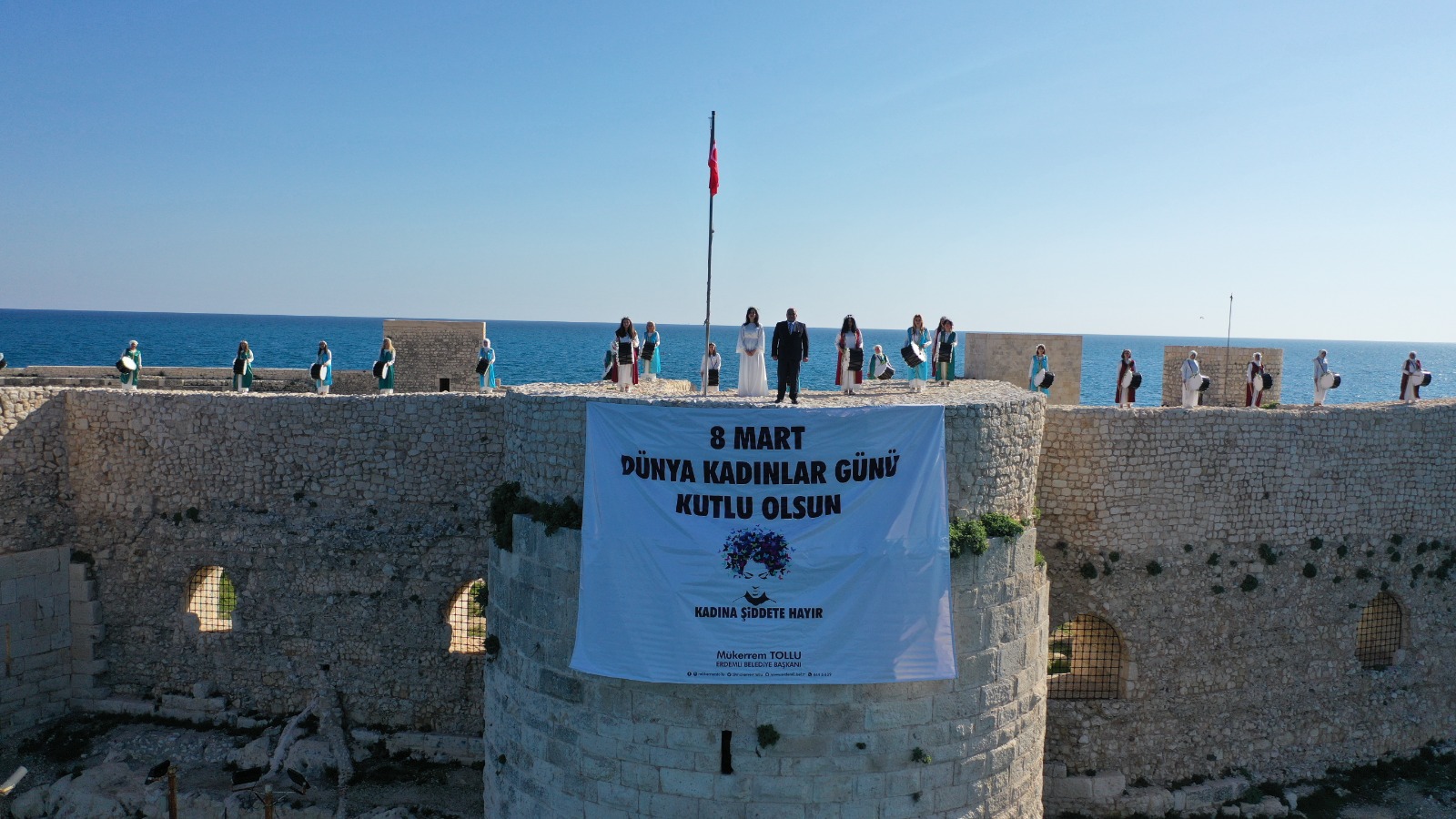 Tarihe inat sapa sağlam ayakta duran Kızkalesi surlarına çıkan 33 kadın söylediği ağıtla gönülleri titretti. Tutulan ritimle kalpler bir atıyor mesajının verildiği programda, ‘Kadına Şiddete Hayır’ pankartını, kalenin surlarından Erdemli Belediye Başkanı Mükerrem Tollu açtı.