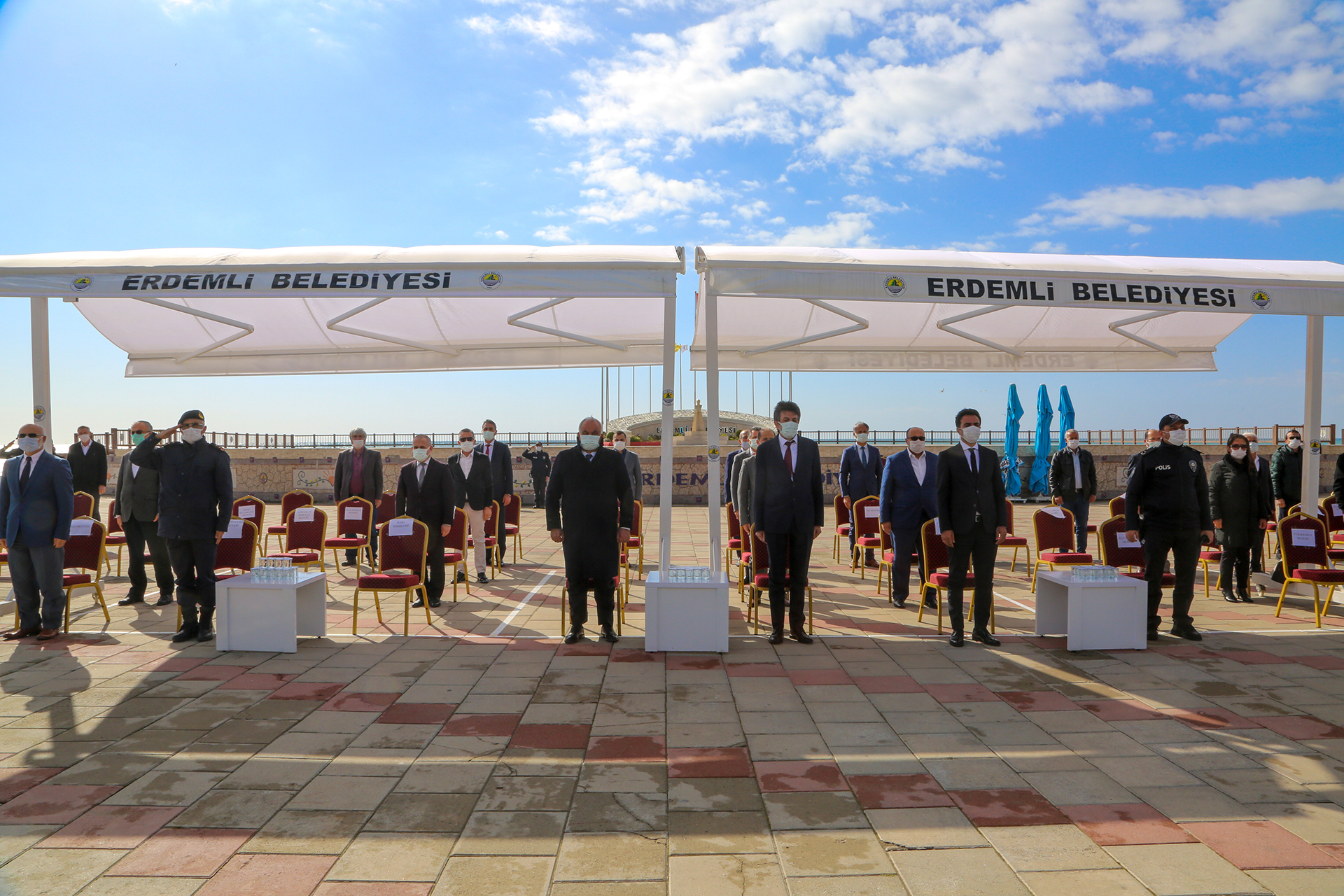 Erdemli Belediyesi Dr. Devlet Bahçeli Meydanında düzenlenen törene, Erdemli Kaymakamı Avni Kula, Erdemli Belediye Başkanı Mükerrem Tollu, Cumhuriyet Başsavcısı Yaşar Özkan, Erdemli İlçe Milli Eğitim Müdürü Yusuf Açıkyörük, Erdemli Erdemli Müftüsü Hayri Erenay, Erdemli İlçe Jandarma Komutan Yrb. Erhan Erdoğan, Gazilerimiz, Sivil toplum kuruluşları temsilcileri ve basın mensupları katıldı.