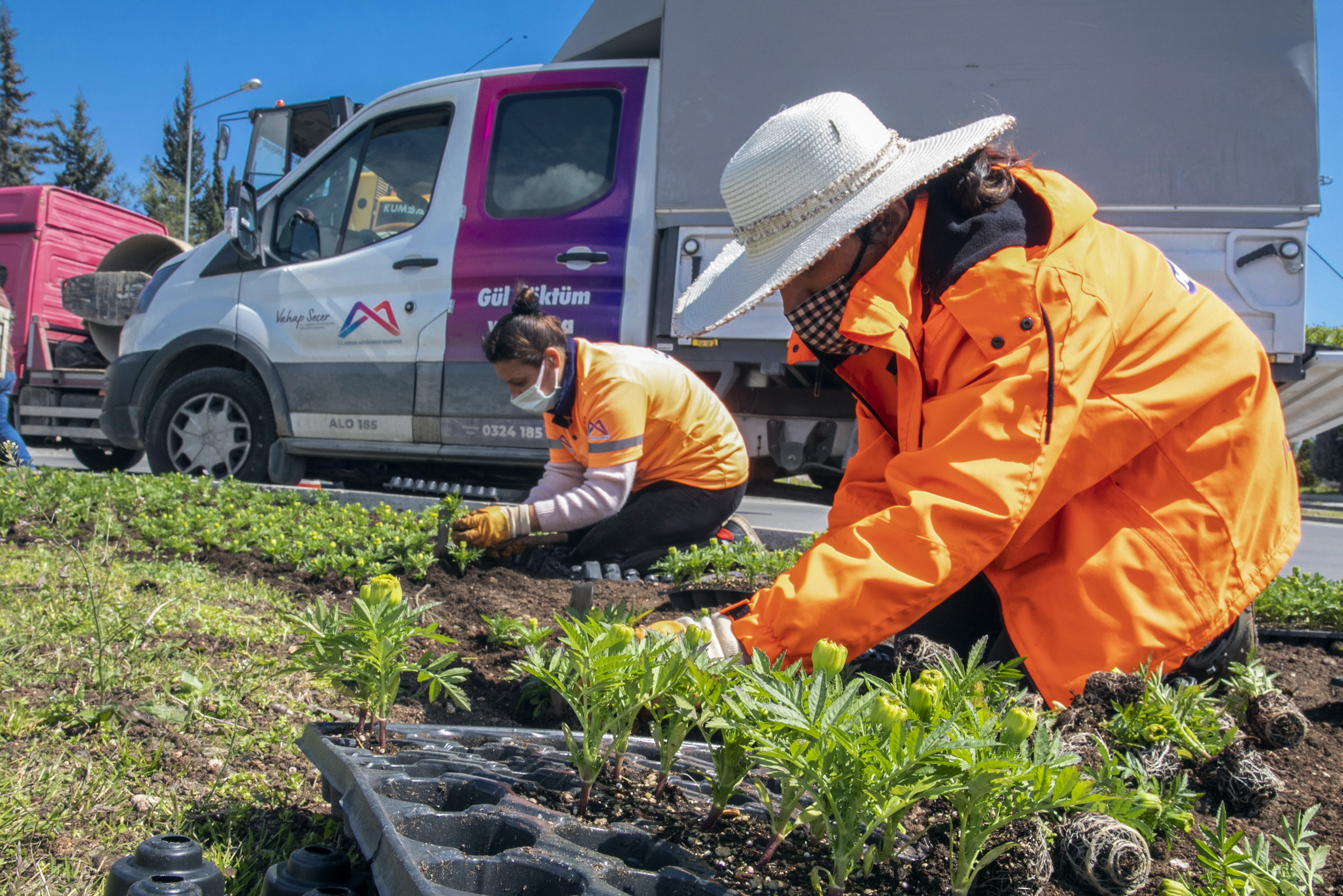 Dikim ekipleri sahada yoğun bir çalışma yürütüyor. Ekip üyelerinin büyük çoğunluğunu Başkan Seçer’in göreve gelmesinden sonra istihdam sağlanan kadınlar oluşturuyor. Güneşe ve toza aldırış etmeyen kadınlar şapkalarını takıp mevsimlik bitkileri toprağa ilmek ilmek işliyor. Çiçek açıp tüm mevsim kenti güzelleştirecek olan o bitkiler, yine kadın kooperatiflerinden temin ediliyor. Çalışma yürütülen noktalardan birisi de Rıfat Uslu Caddesi ile Akbelen Bulvarı’nın kesişimindeki kavşak oldu. Kadınlar, kavşağa yaklaşık 20 bin adet Tagetes bitkisi dikti.