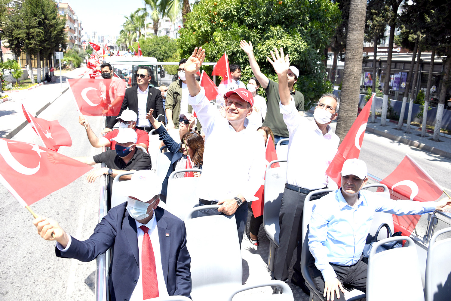Mersin Büyükşehir Belediyesi’nin 19 Mayıs Atatürk’ü Anma, Gençlik ve Spor Bayramı dolayısıyla düzenlediği etkinlikler ile tüm kentte bayram coşkusu yaşanıyor. Etkinliklerde pandemi nedeniyle salgın tedbirlerine azami önem gösteriliyor. Spor etkinlikleri ve gösterilerle başlayan bayram kutlamalarına 19 Mayıs sabahı Tarsus’tan araç konvoyu olarak başlatılan şehir turu ile devam edildi. Üstü açık otobüslerle düzenlenen şehir turuna Başkan Vahap Seçer’in yanı sıra Tarsus Belediye Başkanı Haluk Bozdoğan, CHP Mersin İl Başkanı Adil Aktay, CHP Tarsus İlçe Başkanı Ozan Varal ve Meclis üyeleri katıldı. Vatandaşların evlerinden ve iş yerlerinden ellerinde bayraklar ve alkışlarla eşlik ettiği şehir turunda Başkan Seçer, 19 Mayıs coşkusuna ortak olarak vatandaşları selamladı.