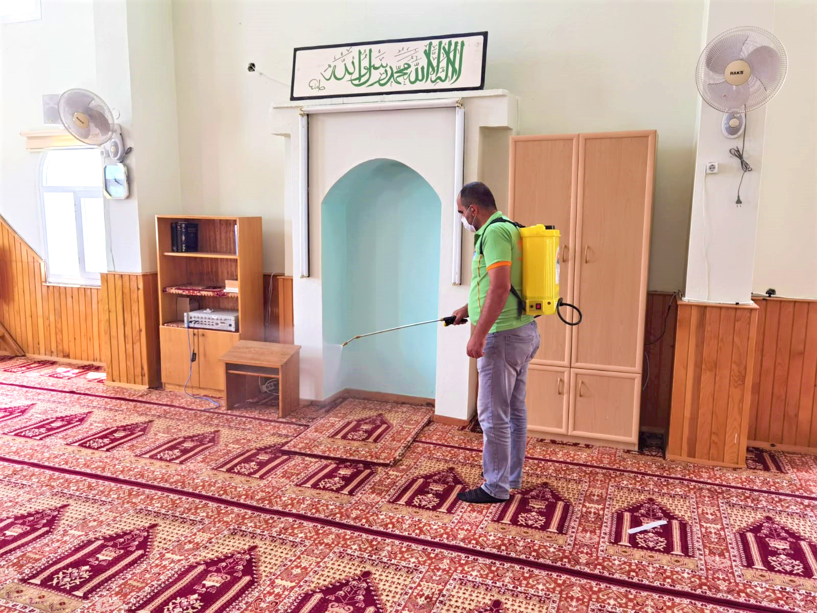 İbadethanelerdeki halılar, halı yıkama makinesiyle yerinde yıkanarak hijyenik hale getirilirken, Covid-19’a karşı avlu, tuvalet, kapı kolları ve ayakkabılık gibi temasın olabileceği tüm yüzeyler dezenfekte edildi.