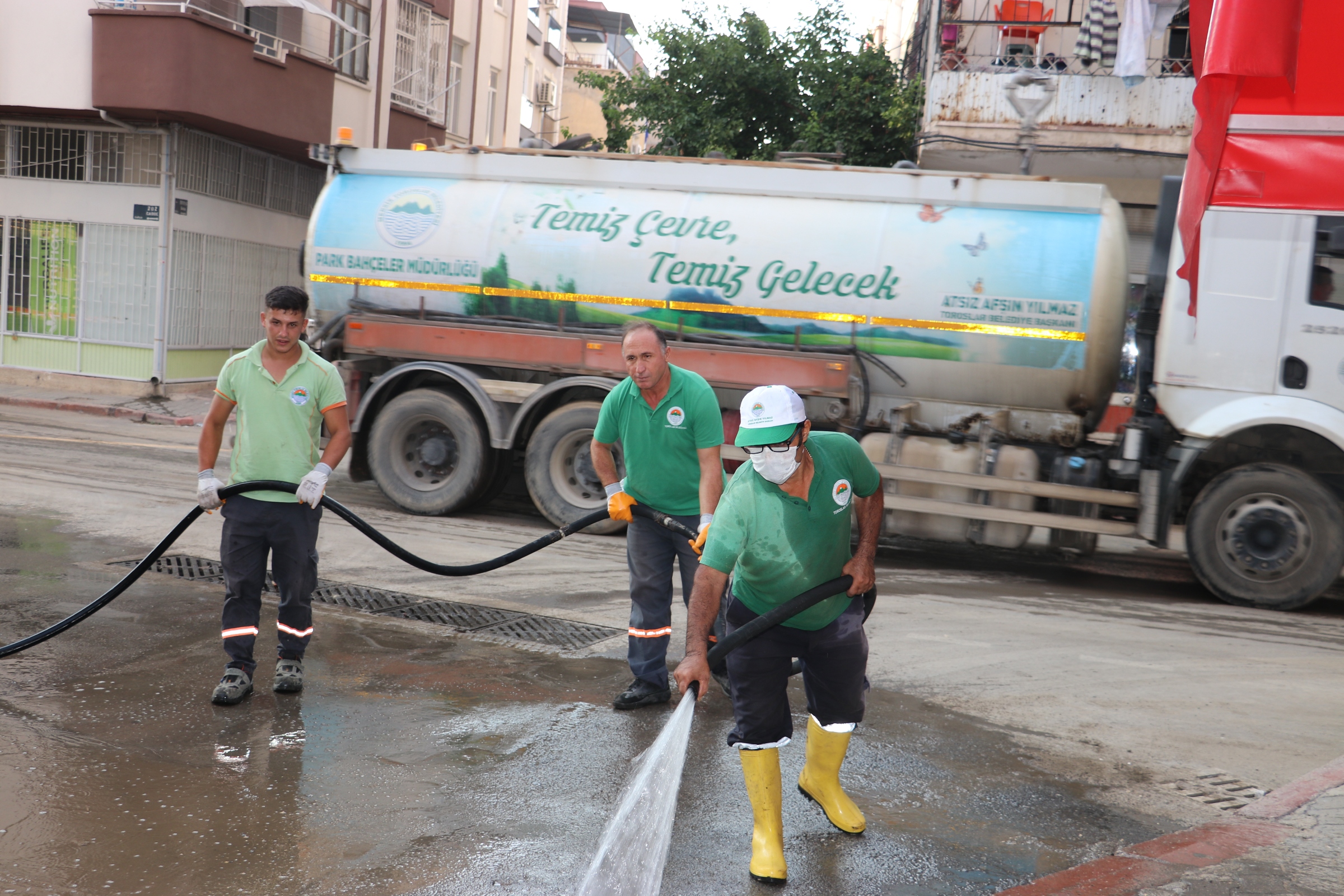 Sokaklar, taşan kanalizasyon sularından temizlenerek dezenfekte edilirken, su ve çamurla dolan evlerde de dezenfekte çalışmaları titizlikle gerçekleştirildi.