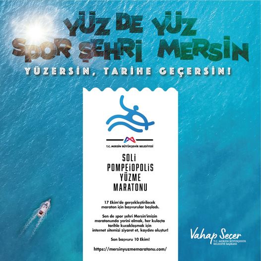 Büyükşehir Belediye Başkanı Vahap Seçer öncülüğünde Mersin, sporun da kenti oluyor. “Yüzersin, tarihe geçersin” sloganıyla Büyükşehir Belediyesi ve Racetiming firmasının ana sporluğunda düzenlenen Mersin Yüzme Maratonu Soli Pompeiopolis Yüzme Yarışı’nın başvuruları başladı. Son kayıt tarihi 10 Ekim 2021 olarak belirlenen maratonda yüzücüler, 17 Ekim’de kent merkezinden başlayarak Mezitli Soli Pompeiopolis Plajı’na kadar kulaç atacak.