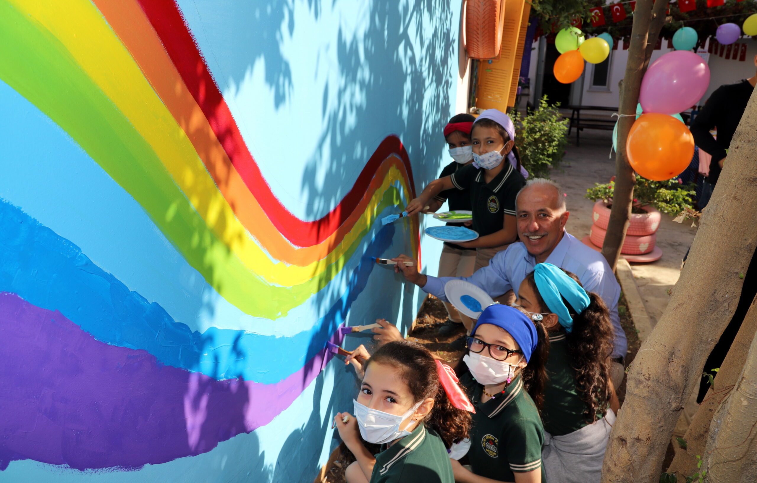 Akdeniz Belediye Başkanı Gültak; “11 Ekim Dünya Kız Çocukları Günü” dolayısıyla düzenlenen özel bir etkinlikte minik kız öğrenciler ile bir araya geldi; onlarla birlikte duvarları rengârenk boyayıp resimler yaptı.