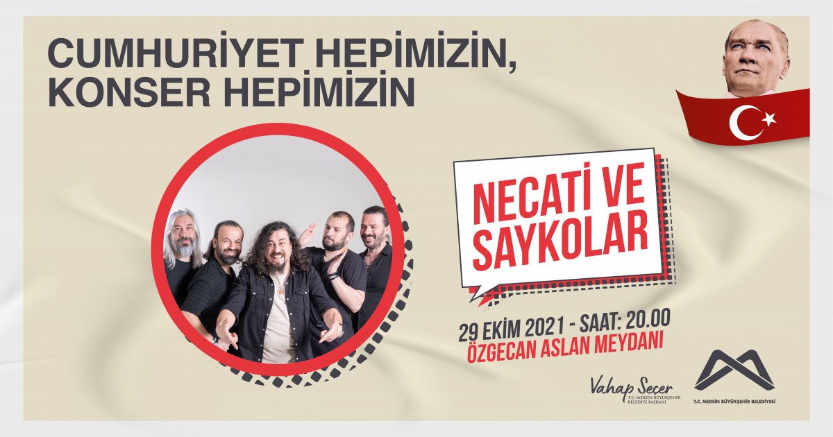 Mersin Büyükşehir Belediyesi Kültür ve Sosyal İşler Dairesi, 29 Ekim Cumhuriyet Bayramı’nın 98’inci yıldönümü dolayısıyla bu yıl da coşku dolu konserler düzenliyor. “Cumhuriyet Hepimizin, Konser Hepimizin” sloganıyla ücretsiz düzenlenen konserlerde Athena, Mor ve Ötesi, Necati ve Saykolar ile Grup Cosmos sahne alacak.