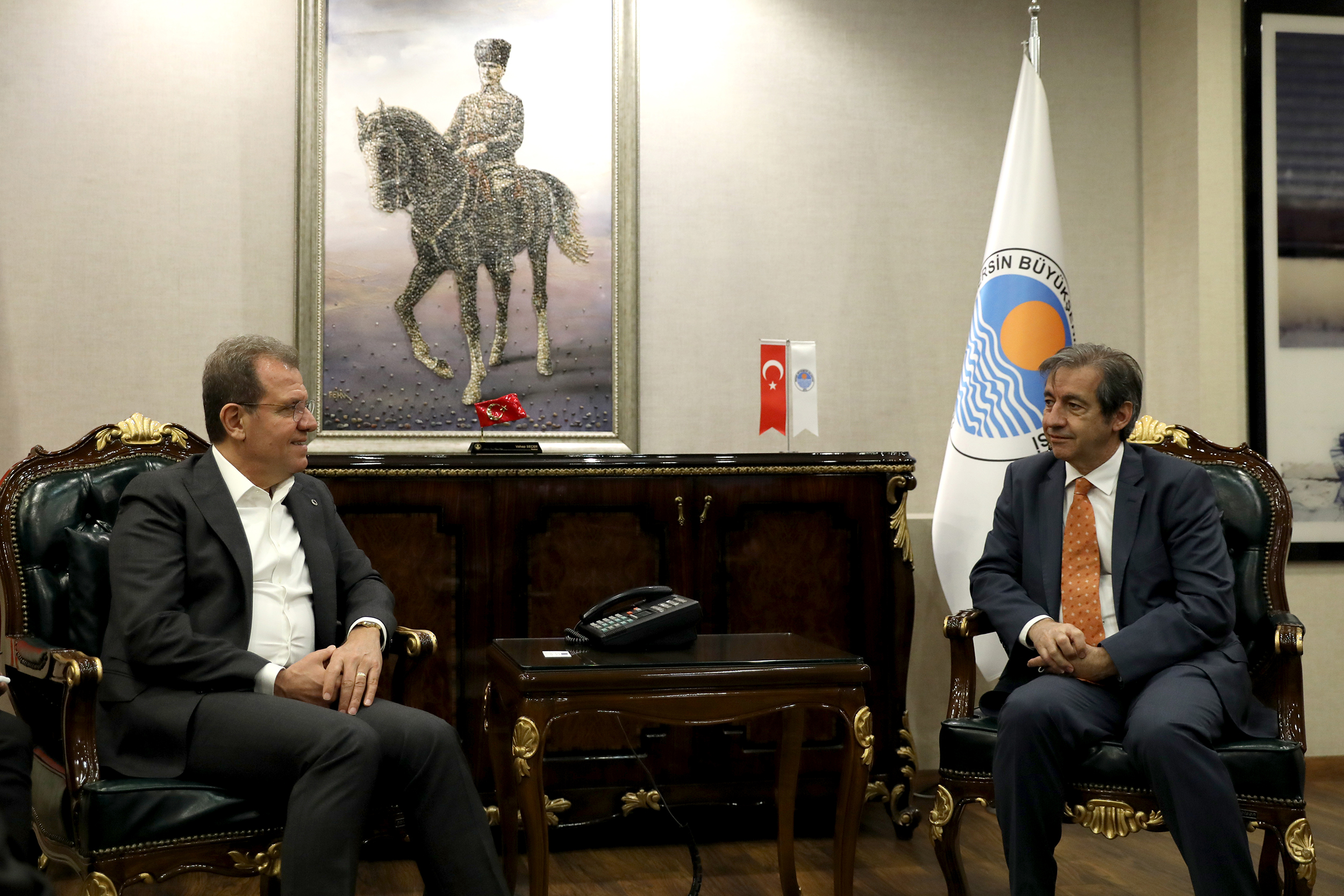 Mersin Büyükşehir Belediye Başkanı Vahap Seçer, Avrupa Birliği Türkiye Delegasyonu Ekonomik ve Sosyal Kalkınma Birimi Müsteşarı Angel Gutierrez Hidalgo ve İklim Değişikliği ve Ulaşım Birim Koordinatörü Göktuğ Kara ile bir araya geldi.