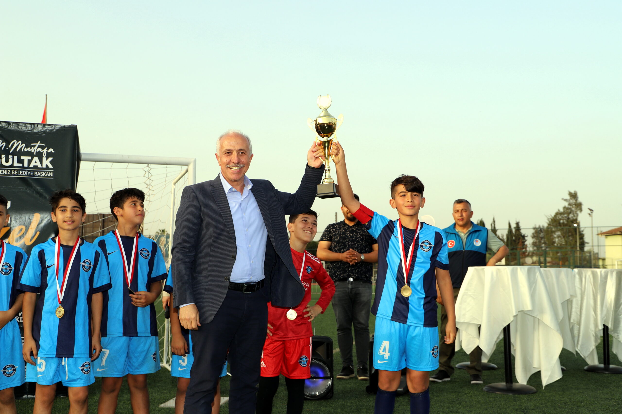 Akdeniz ilçesinde mücadele veren futbol kulüplerinin U-10, U-11 ve U-12 yaş gruplarının katıldığı 23 Nisan Futbol Turnuvası’nın final maçları ve ödül töreni, Seyfi Ali Türkoğlu – Şafak Erdur Futbol Sahası’nda düzenlendi. Törene, Akdeniz Belediye Başkanı M. Mustafa Gültak, Başkan Yardımcıları ve Meclis üyeleri, Mersin Amatör Spor Kulüpleri Federasyonu Başkanı Mithat Ertaş, Türkiye Futbol Antrenörleri Derneği Şube Başkanı Mesut Bilir ve Mersin İdman Yurdu’nun efsane futbolcularından Ayhan Öz katıldı.
