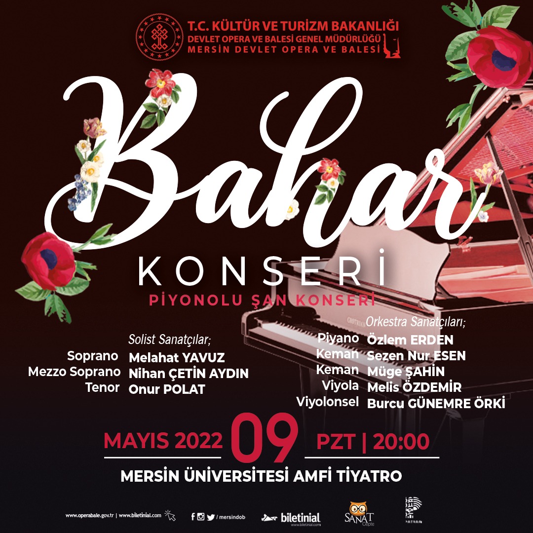 Mersin Üniversitesi’nin 30. Yılı kutlamaları kapsamında 9 Mayıs 2022 Pazartesi saat 20:00’da, Mersin Üniversitesi Amfi Tiyatroda gerçekleşecek olan Piyanolu Şan Konserinin Solist Sanatçıları; Melahat Yavuz, Nihan Çetin Aydın, Onur Polat olacak.