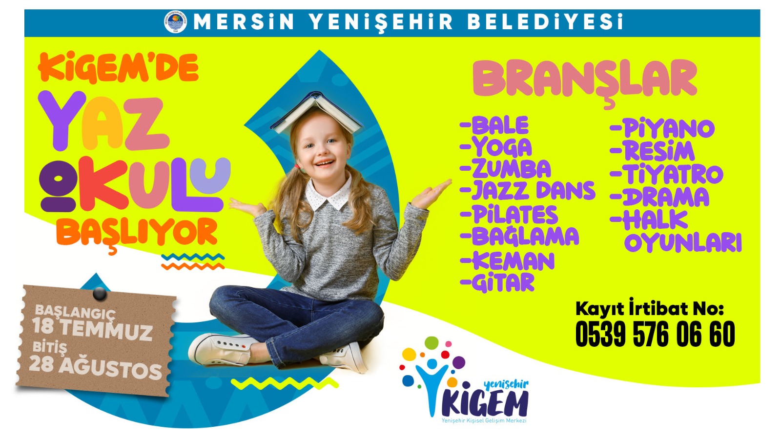 Mersin Yenişehir Belediyesi Kişisel Gelişim Merkezi(KİGEM)’nde yaz boyunca verilecek kültür ve sanat kursları için kayıtlar başladı. Tiyatrodan baleye, yogadan halk oyunları ve enstrüman kurslarına kadar 13 farklı branşta kurslar verilecek. Eğitim ve Hareket ilkleri kapsamında Yenişehirlileri kültür ve sanat eğitimleriyle buluşturduklarını ifade eden Mersin Yenişehir Belediye Başkanı Abdullah Özyiğit, tüm vatandaşları kurslara kayıt yapmaya davet etti.