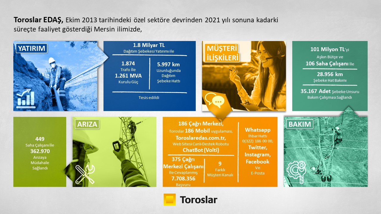 Toroslar EDAŞ elektrik dağıtım faaliyetlerinin özel sektöre devredildiği 2013’ten 2021 yılı sonuna kadar, Mersin özelinde 1 milyar 800 milyon lira (2021-Haziran fiyatlarıyla) tutarında yatırım gerçekleştirdi.