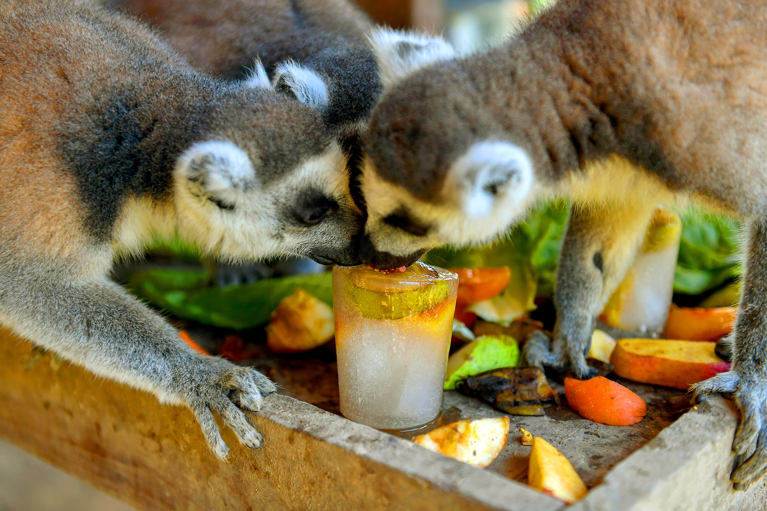 Tarsus Doğa Parkı’nın ilgi çeken hayvanlarından olan halka kuyruklu lemurlar başta olmak üzere, babun, örümcek maymunu ve ayılara, kokteyl şeklinde hazırlanmış buzlu meyve veya dondurulmuş yiyecekler veriliyor.