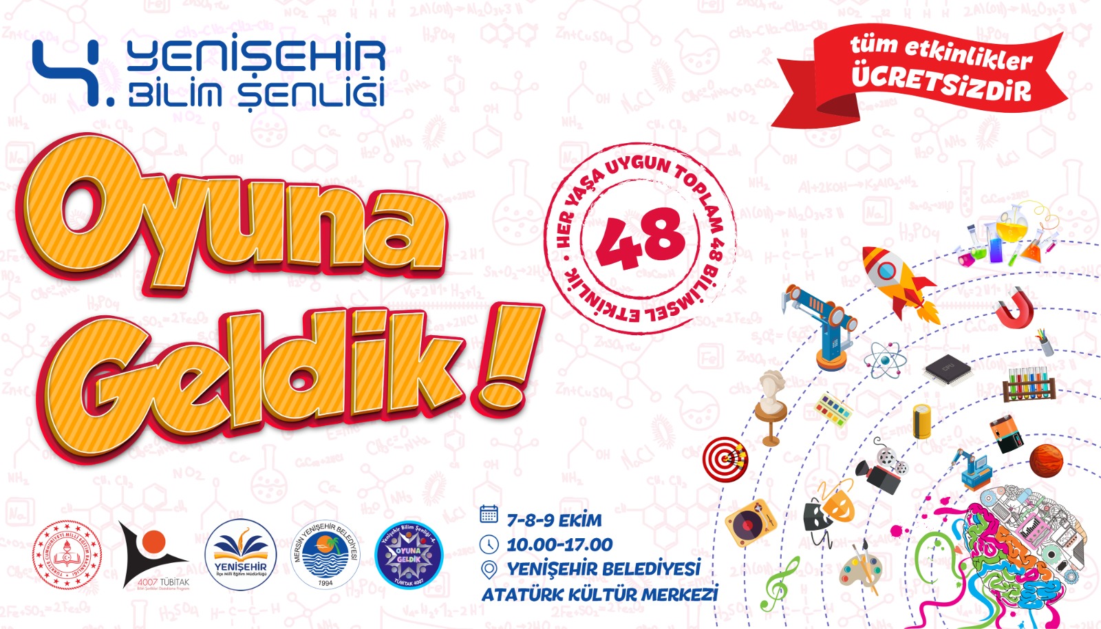 4. Yenişehir Bilim Şenliği “Oyuna Geldik” sloganıyla 7-8-9 Ekim tarihlerinde 10.00-17.00 saatleri arasında Yenişehir Belediyesi Atatürk Kültür Merkezi’nde yapılacak. Şenlikte kurulacak planetaryumda iklim değişikliği gösterileri ve 38 atölyede toplam 48 adet etkinlik düzenlenecek ve tüm etkinlikler ücretsiz bir şekilde vatandaşlarla buluşacak.