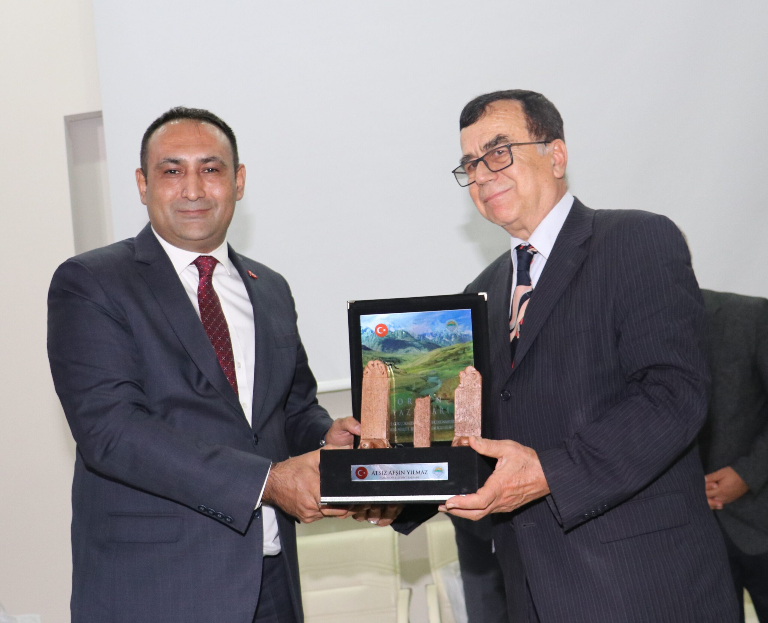 Toroslar Belediye Başkanı Atsız Afşın Yılmaz, programın sonunda Türk Dünyası Araştırmaları Vakfı Genel Başkanı Közhan Yazgan, Mersin Bölge Temsilcisi Seyfettin Sindar ile programa katkı sunan akademisyenler Prof. Dr. Ramazan Taşdurmaz, Dr. Gökhan Tarıman Cenikoğlu ve Prof. Dr. Mehmet Çeribaş ile eski milletvekili Cahit Tekelioğlu’na Türk dili, kültürü ve tarihinin en değerli anıtlarından olan Orhun Yazıtları’nın minyatür örneğini hediye ederek teşekkür etti.