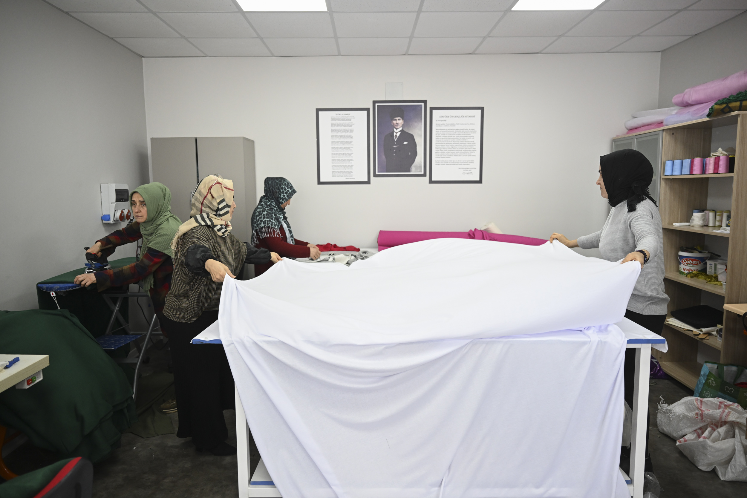 Mersin Büyükşehir Belediyesi Sosyal Hizmetler Dairesi Başkanlığı’na bağlı Mesleki Eğitim Merkezi (MERCEK)’nde daha önce giysi dikmeyi öğrenen eller, şimdi depremzedeler için battaniye, giysi, yastık ve nevresim takımları üretiyor.
