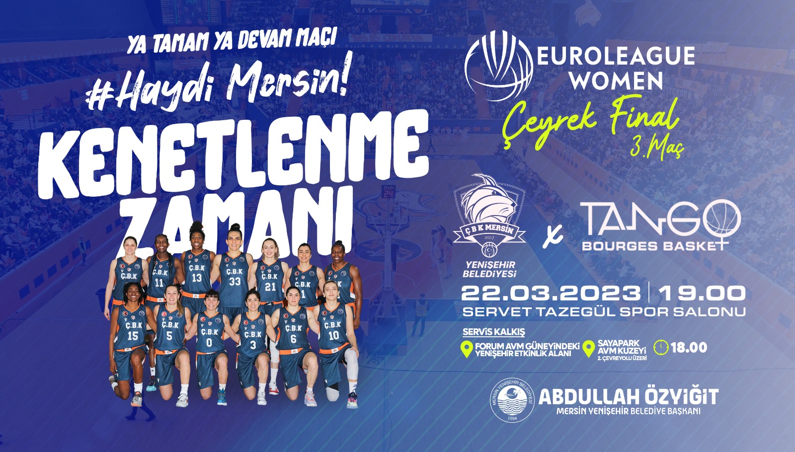 Çukurova Basketbol Kulübü(ÇBK) Mersin Yenişehir Belediyesi, Euroleague Women çeyrek finalinin üçüncü ve son maçına çıkıyor. Fransa temsilcisi Tango Bourges Basket’i sahasında ağırlayacak olan turuncu-lacivertliler kazanması halinde Avrupa’nın en büyük kupası için Final-Four’a yükselecek. Yenişehir Belediye Başkanı Abdullah Özyiğit, sezonun en kritik maçı için Mersinlileri maça davet ederek, destek çağrısında bulundu.