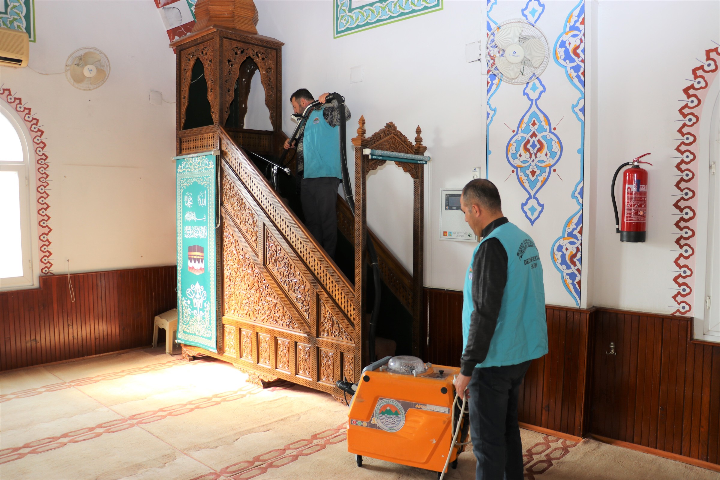 İbadethanelerdeki halılar, halı yıkama makinesiyle yerinde yıkanırken; avlu, tuvalet, kapı kolları ve ayakkabılık gibi temasın olabileceği tüm yüzeyler dezenfekte ediliyor.