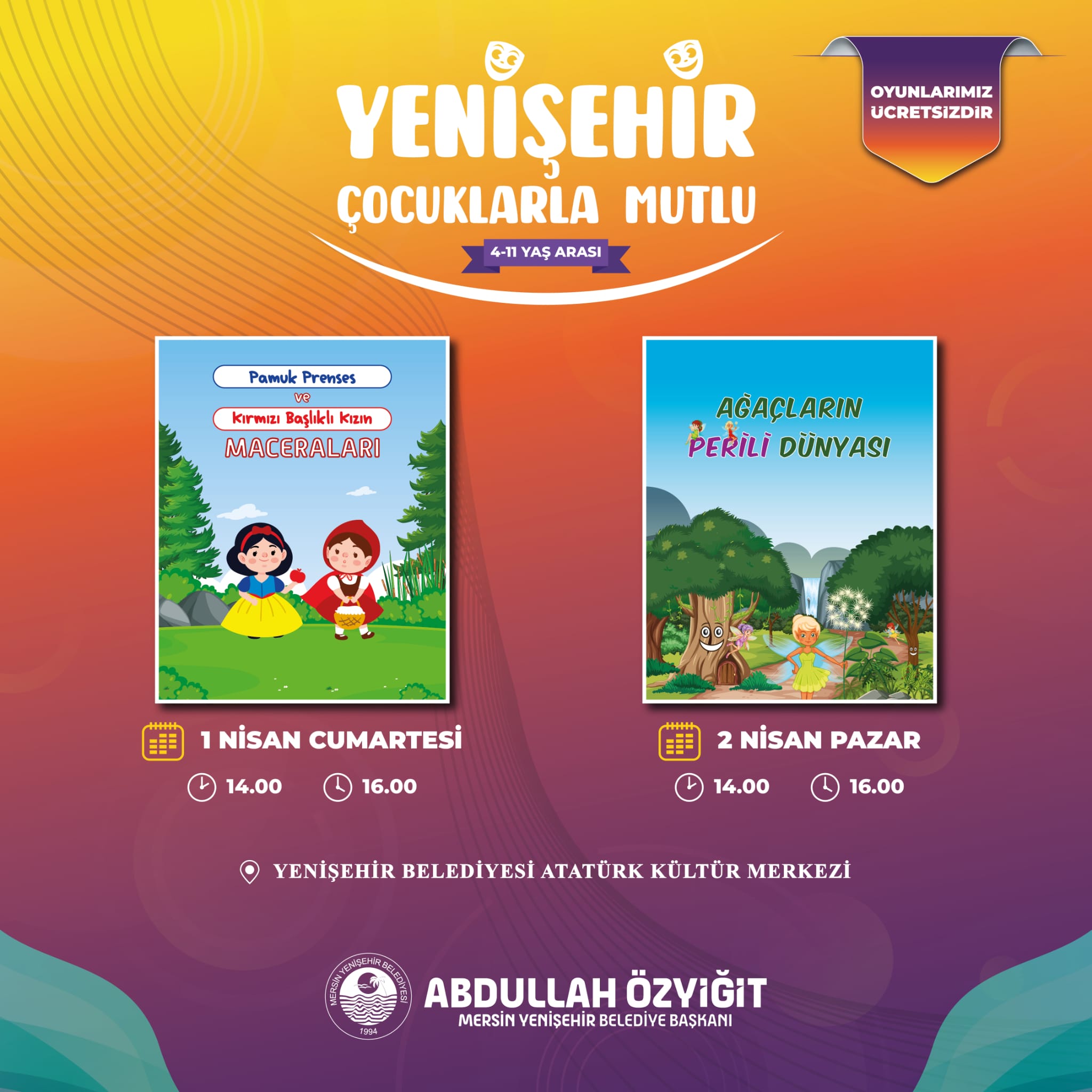 “Pamuk Prenses ve Kırmızı Başlıklı Kızın Maceraları” oyunu 1 Nisan Cumartesi günü 14.00 ve 16.00 saatlerinde, Ağaçların Perili Dünyası oyunu ise 2 Nisan Pazar günü 14.00 ve 16.00 saatlerinde 4-11 yaş arası çocuklar için sahnelenecek. Yenişehir Belediye Başkanı Abdullah Özyiğit, “Sosyal demokrat belediyeler olarak dayanışmayla deprem felaketinin meydana getirdiği tüm olumsuzluklara karşı mücadele ediyoruz. İlk günden bu yana hem barınma hem de temel ihtiyaç malzemesi desteğiyle büyük bir özveriyle yurttaşlarımıza destek veriyoruz. Deprem bölgesinden kentimize on binlerce yurttaşımız geldi. Burada yaşamlarına devam ediyorlar, biz de tüm imkanlarımızla yanlarında oluyoruz. Şeker Tiyatro Topluluğu ekibi de deprem mağdurlarından, sahnelerimizi kendilerine açtık. Oyunlarımız çocuklarımız için ücretsiz olacak. Tüm çocuklarımızı bekliyoruz. Dün ayrıca 27 Mart Dünya Tiyatro Günü’nü kutladık, bu vesileyle tüm tiyatro emekçilerini ve sanata değer katan herkesi saygıyla selamlıyorum.”diye konuştu.