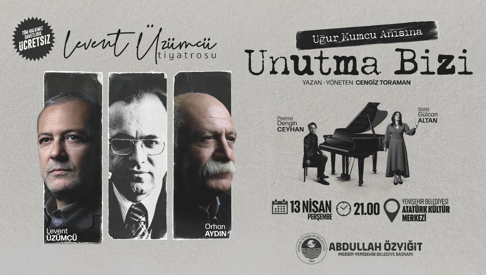 Mersin Yenişehir Belediyesi, Cengiz Toraman tarafından yazıp yönetilen, Levent Üzümcü Tiyatrosu tarafından sahnelenen “Unutma Bizi” oyununu Mersinli sanatseverlerle buluşturacak. Oyun, 13 Nisan Perşembe günü saat 21.00’de Yenişehir Belediyesi Atatürk Kültür Merkezi’nde ücretsiz sahnelenecek. Orhan Aydın ve Levent Üzümcü oyunda Uğur Mumcu’nun hayatını anlatacak. Tiyatroda piyanist Dengin Ceyhan ve solist Gülcan Altan da sahne alacak.