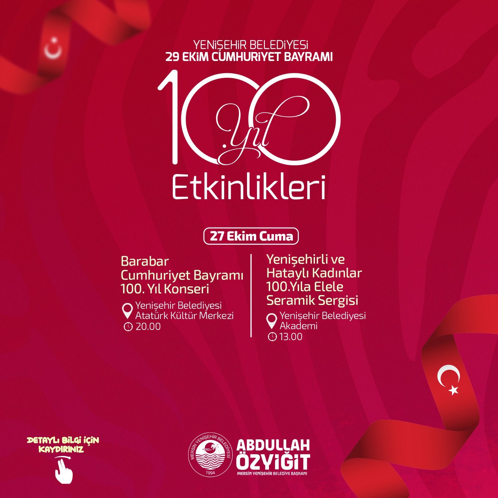 Yenişehir Belediye Başkanı Abdullah Özyiğit, Cumhuriyetin kuruluşunun yüzüncü yılını hep birlikte kutlamak üzere Mersinlileri düzenleyecekleri etkinliklere katılmaya davet etti.