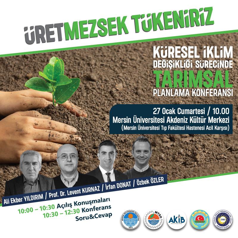 Mersin Büyükşehir Belediyesi, Mersin Ticaret ve Sanayi Odası (MTSO), Akdeniz İhracatçılar Birliği (AKİB), Türkiye Ziraat Odaları Birliği (TZOB) ve TMMOB Ziraat Mühendisleri Odası Mersin Şubesi işbirliğinde; ‘Üretmezsek Tükeniriz’ başlığıyla ‘Küresel İklim Değişikliği Sürecinde Tarımsal Planlama Konferansı’nın bu yıl 3.’sü yapılacak.