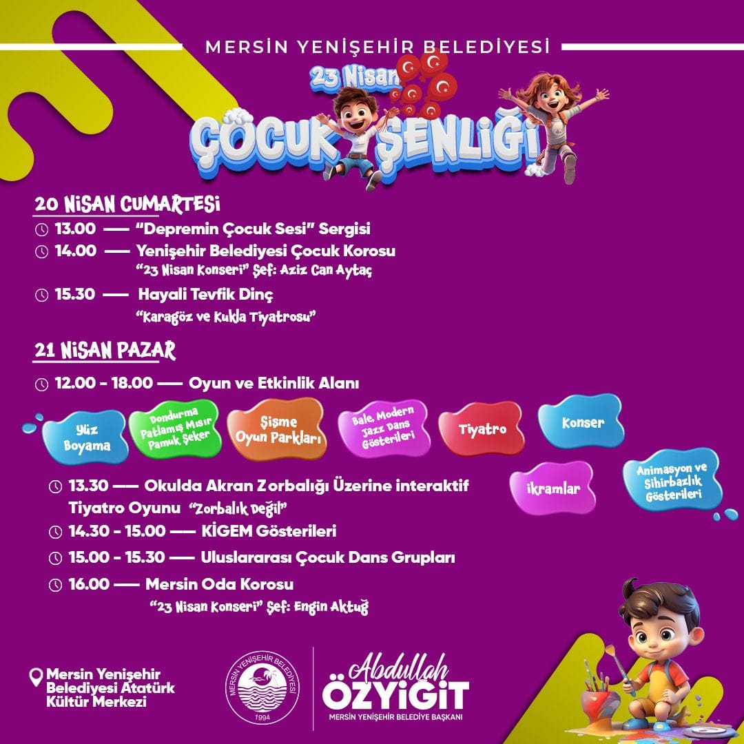 Yenişehir Belediyesinin 23 Nisan Ulusal Egemenlik ve Çocuk Bayramı kutlamaları kapsamında hazırladığı etkinlik programı Yenişehir Belediyesi Atatürk Kültür Merkezinde 20 Nisan saat 13.00’de “Depremin Çocuk Sesi” sergisiyle başlayacak ve ardından saat 14.00’de Yenişehir Belediyesi Çocuk Korosu “23 Nisan Konseri” ile sahne alacak. Saat 15.30’da ise Hayali Tevfik Dinç “Karagöz ve Kukla Tiyatrosu” çocuklarla buluşacak.