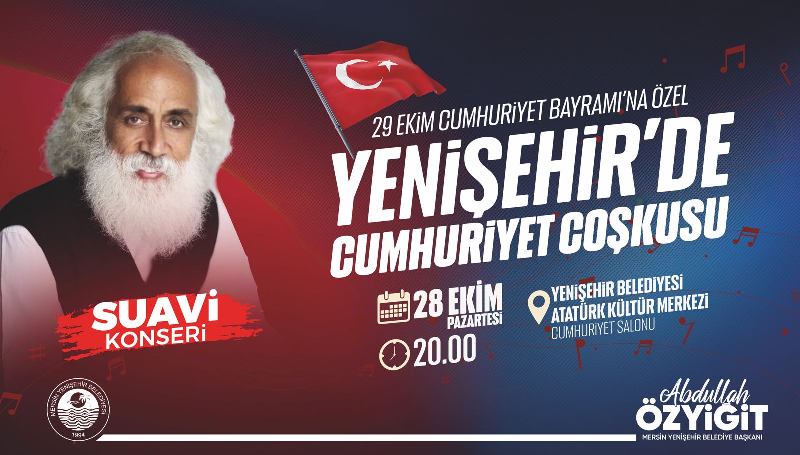 Mersin Yenişehir Belediyesi her yıl olduğu gibi bu yılda 29 Ekim Cumhuriyet Bayramı’na özel bir dizi etkinlik programı hazırladı. Yenişehir Belediyesinin 29 Ekim kutlamaları, sevilen sanatçı Suavi’nin konseriyle başlayacak. Usta sanatçı, bugün saat 20.00’de Yenişehir Belediyesi Atatürk Kültür Merkezi’nde sahne alacak. Kutlamalar kapsamında 29 Ekim Salı günü ise araçlı Cumhuriyet korteji düzenlenecek.