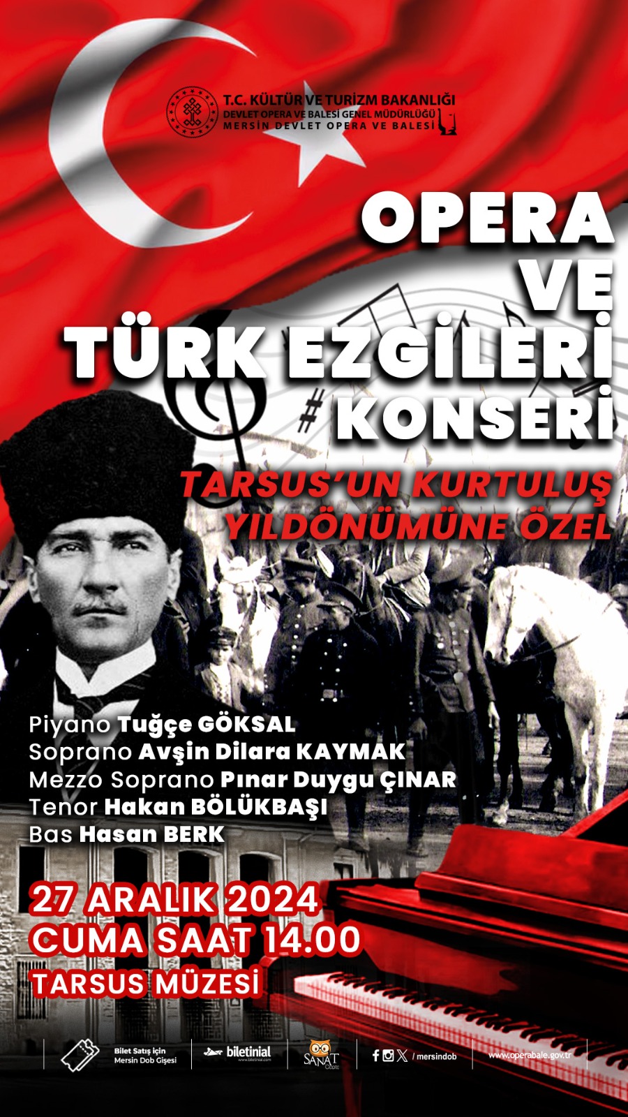 27 Aralık Cuma günü ise Tarsus Müzesi’nde saat 14:00’de “Opera ve Türk Ezgileri Konseri”ile sanatseverler ile buluşturacak. Solist sanatçılar Avşin Dilara Kaymak, Pınar Duygu Çınar, Hakan Bölükbaşı, Hasan Berk’e piyanoda Tuğçe Göksal eşlik edecek.