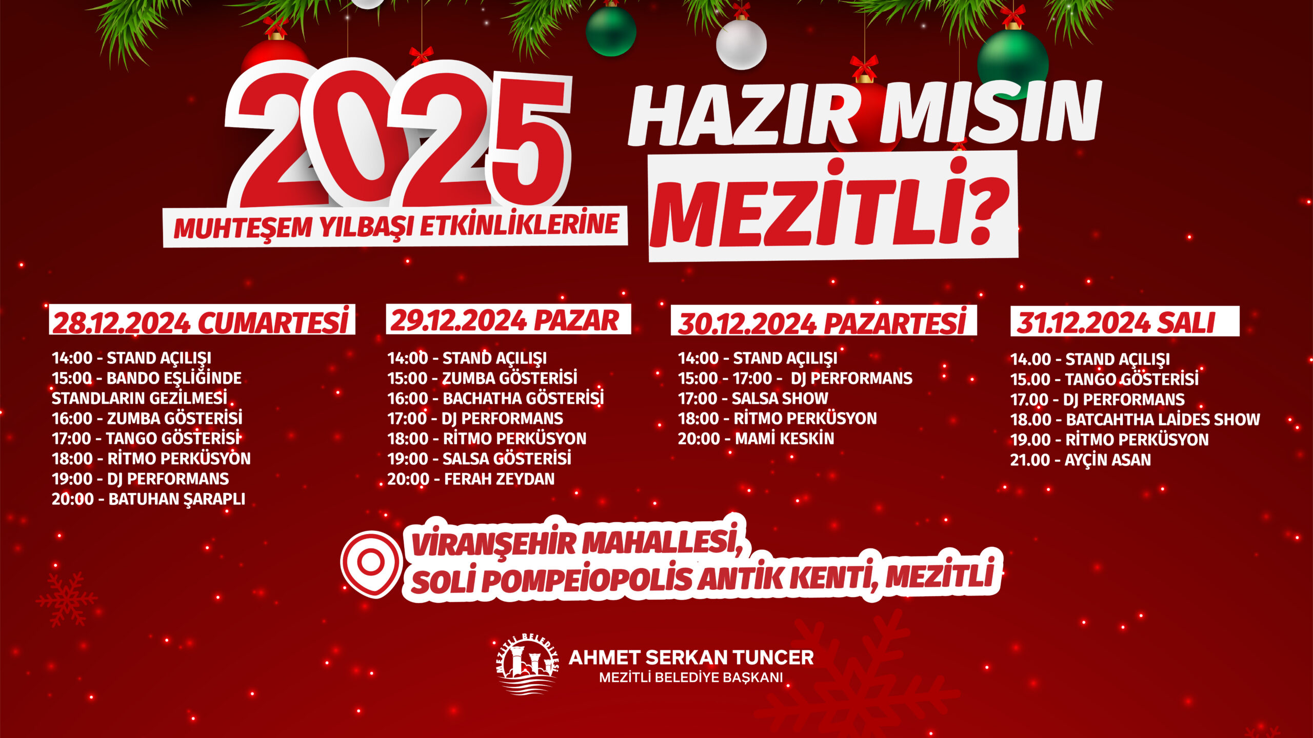 Mezitli Belediyesi, 2025 yılına büyük bir coşkuyla merhaba demek için dolu dolu bir etkinlik programı hazırladı.2025 yılına sayılı günler kala Mezitli Belediyesi, muhteşem bir etkinlik takvimine imza atacak. 4 gün sürecek etkinlikler ile yeni yıl ruhu doyasıya yaşanacak. Etkinlikler, 28 Aralık Cumartesi günü başlayıp 31 Aralık Salı günü sona erecek ve Viranşehir Mahallesi, Soli Pompeipolis Antik Kenti’nde düzenlenecek.