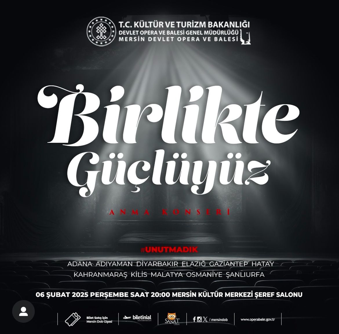Mersin Devlet Opera ve Balesi “Birlikte Güçlüyüz” anma konserini 6 Şubat 2025 Perşembe günü Mersin Kültür Merkezi Şeref Salonu’nda saat 20:00’de gerçekleştirecek.