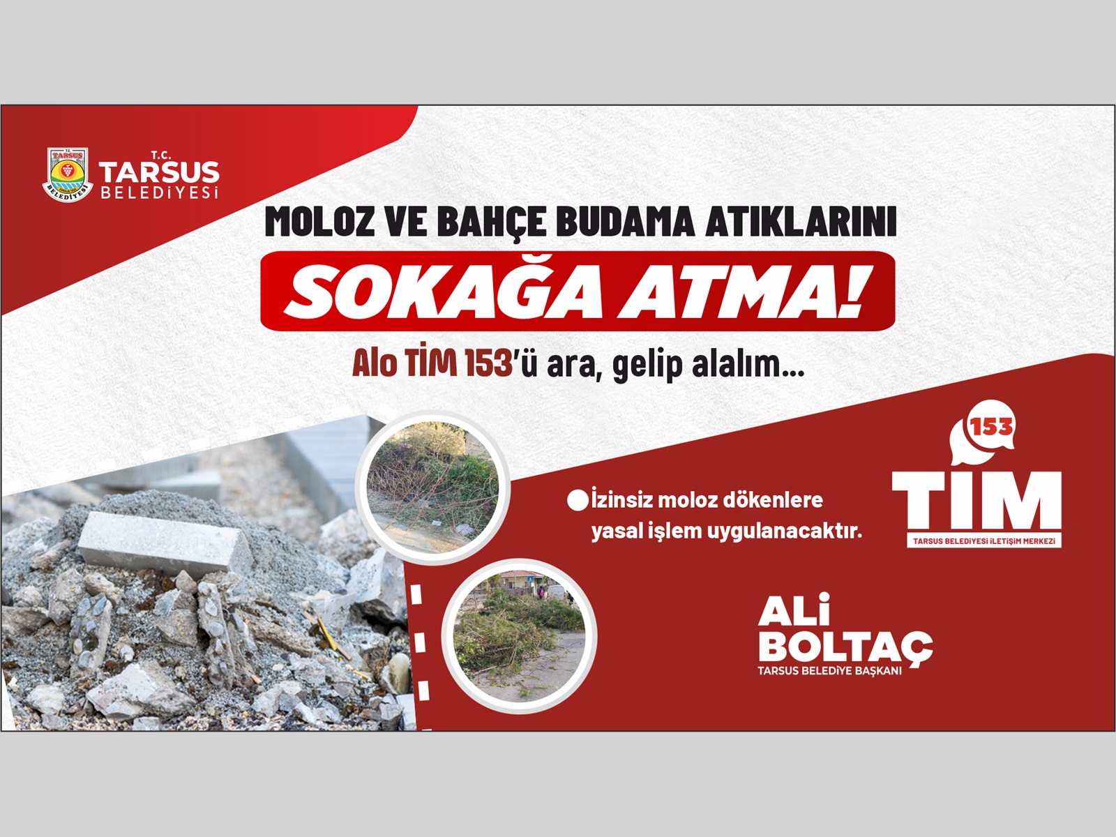 Tarsus Belediyesi, çevre temizliği ve düzenini sağlamak amacıyla şehir genelinde budama ve moloz atıkları toplama hizmetini sürdürüyor. Ev, site ve bahçelerden çıkan budama ve moloz atıkları, ALO TİM 153 hattına bildirilerek belediye ekipleri tarafından toplanıyor.