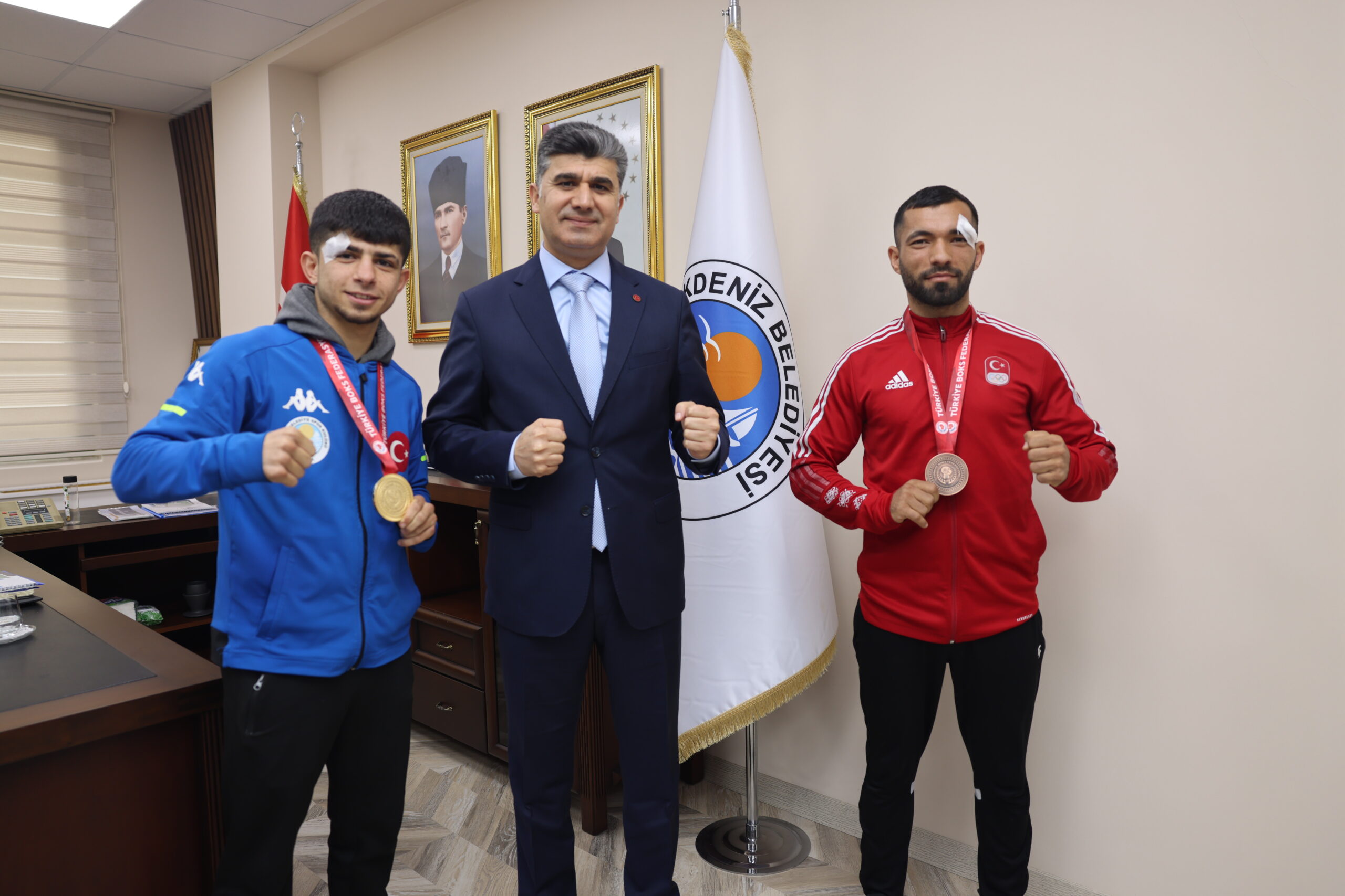 Konya’da düzenlenen Büyük Erkekler Türkiye Ferdi Boks Şampiyonası’nda büyük başarılar elde eden Akdeniz Belediyesi Spor Kulübü sporcuları, memleketlerine gururla döndü. 51 kiloda Türkiye şampiyonu olarak altın madalya kazanan sporculardan Ulaş Yalçınkaya ve 57 kiloda Türkiye üçüncüsü olarak bronz madalya kazanan sporcu Hatip Emlek, Akdeniz Kaymakamı ve Belediye Başkan V. Zeyit Şener’i makamında ziyaret etti.