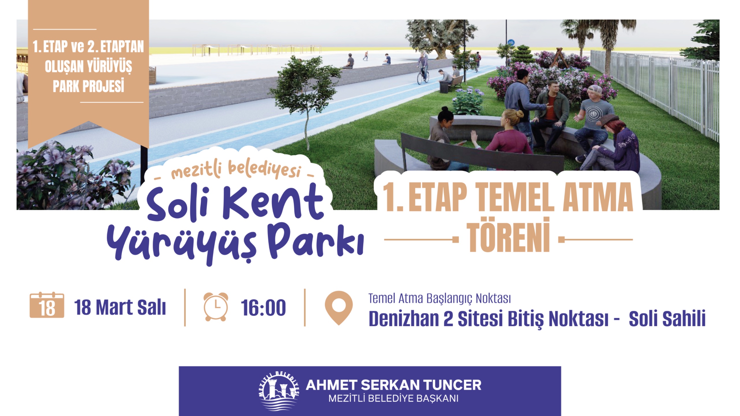 Mezitli Belediye Başkanı Ahmet Serkan Tuncer’in Mezitli’nin göz alıcı sahil alanında hayata geçireceği projelerden olan Soli Kent Yürüyüş Parkı projesinin 1. Etap temel atma töreni 18 Mart Salı günü saat 16:00’da, Denizhan 2 Sitesi Bitiş Noktası -Soli Sahili’nde gerçekleştirilecek. Başkan Tuncer; ”Temel atma törenimize tüm vatandaşlarımız davetlidir” dedi.