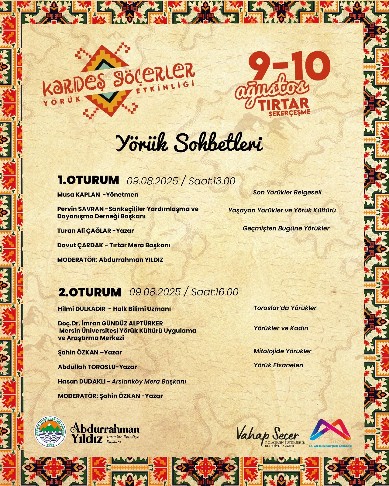 Toroslar Belediye Başkanı Abdurrahman Yıldız, “Bu hafta sonu 9 ve 10 Ağustos günlerinde, Toroslarımızın en güzel yaylalarından olan Tırtar köyümüzün biraz daha ilerisinde, Şekerçeşme diye bilinen alanda 2 gün boyunca bir Yörük festivali yapacağız. Festivalimizde muhtelif eğlencelerimiz olacak, panellerimiz olacak, konserlerimiz olacak, yiyecek içecek stantlarımız olacak. 2 gün boyunca hep beraber çok güzel vakit geçirmeyi planlıyoruz” dedi.
