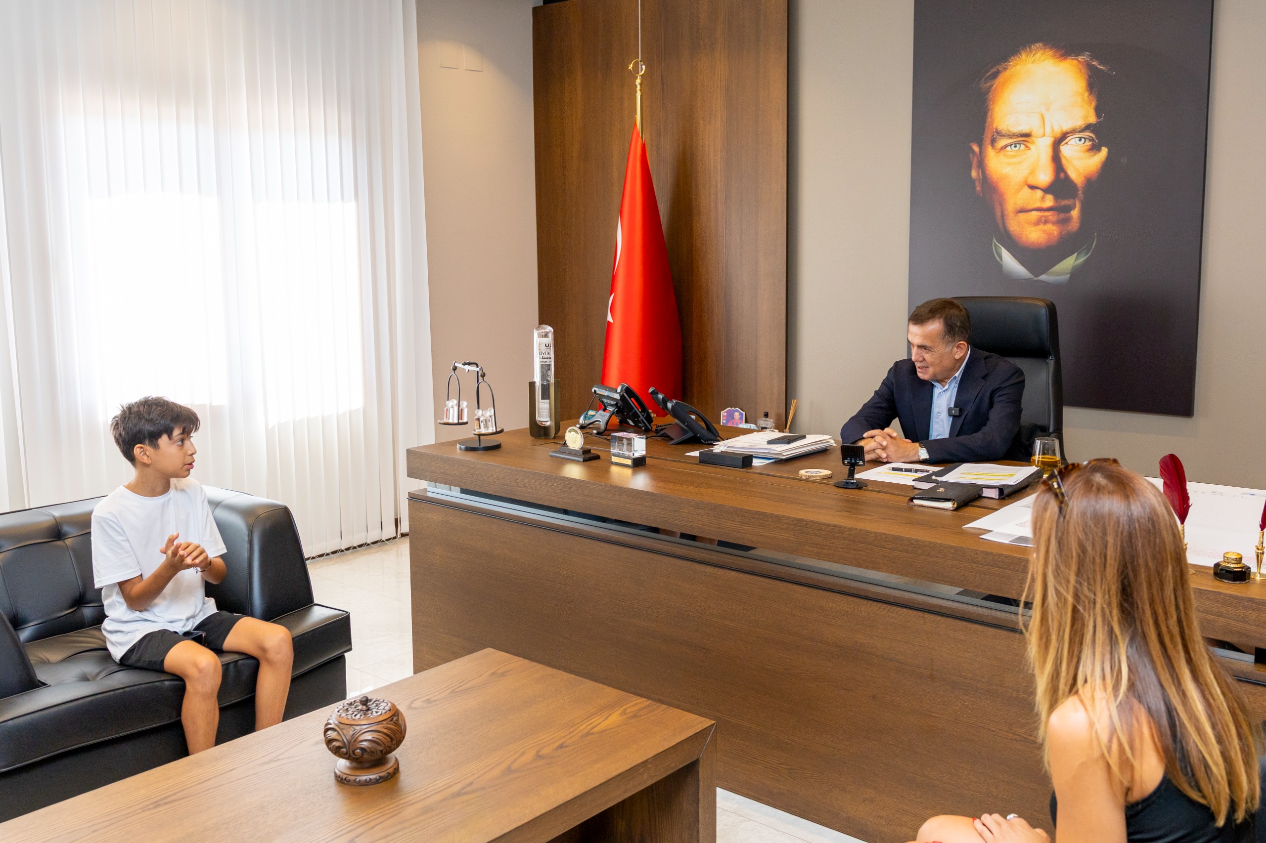 Başkan Abdullah Özyiğit, minik çevreci Aras Kayretli ile buluştu