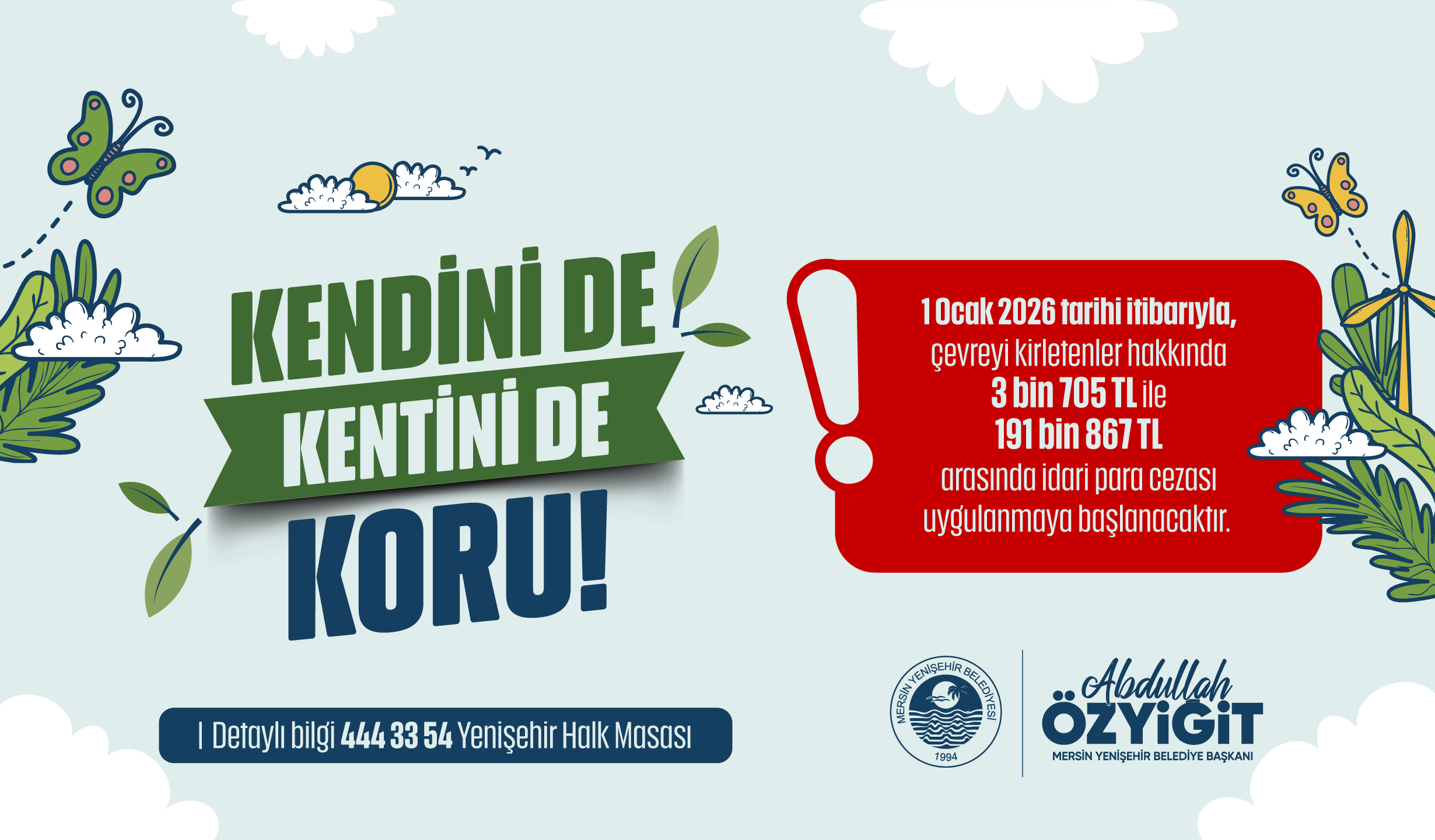 Mersin Yenişehir Belediyesi, çevre kirliliğiyle mücadele kapsamında “Kendini de Kentini de Koru” sloganıyla 2026 yılı itibarıyla yeni bir uygulama sürecini hayata geçiriyor. Kent estetiğini bozan, çevre sağlığını tehdit eden ve kamu düzenini olumsuz etkileyen davranışlara karşı denetimler artırılacak.