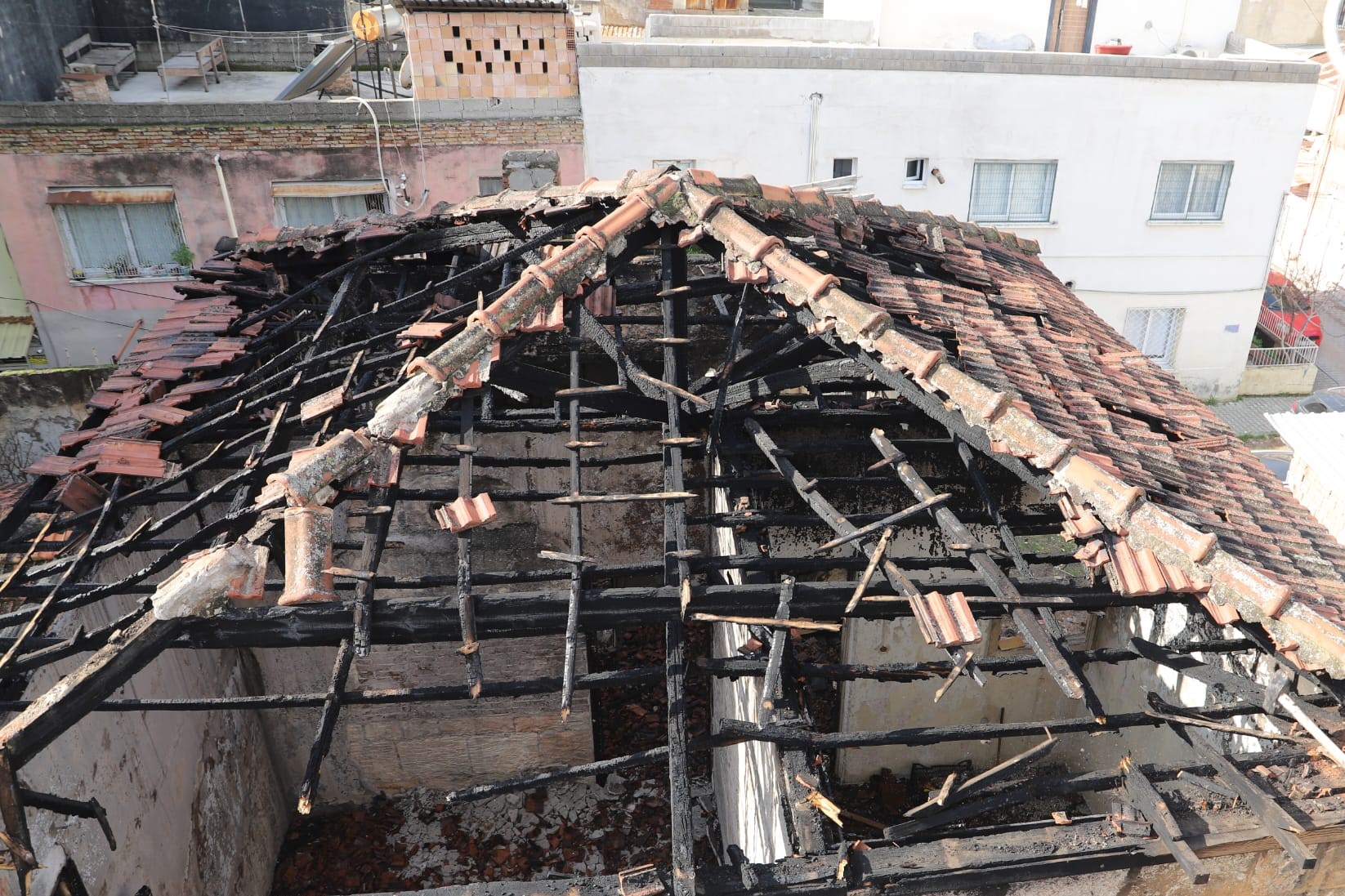 Akdeniz Belediyesi Fen İşleri Müdürlüğü’ne bağlı ekipler, Çankaya Mahallesi 4734 sokak numara 3 adresinde bulunan Tarihi Mersin Evinde, çıkan yangın sonucu zarar gördüğü için vatandaşların can ve mal güvenliğini tehdit eden çatıdaki kiremitleri, ahşap ve kalasları kontrollü şekilde aşağı düşürdü.