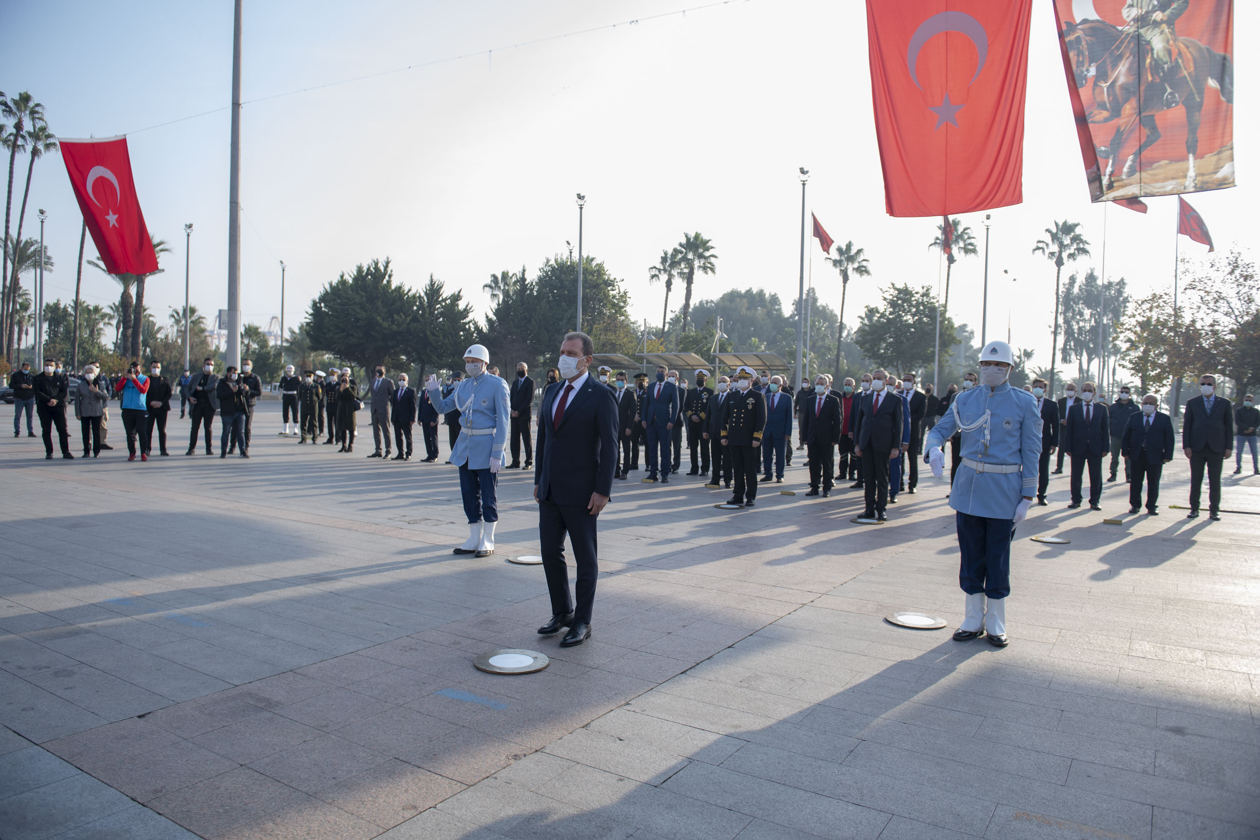 Cumhuriyet Meydanı’nda düzenlenen törene Mersin Valisi Ali İhsan Su, Akdeniz Bölge ve Garnizon Komutanı Tuğamiral Fuat Gedik, Mersin Büyükşehir Belediye Başkanı Vahap Seçer, milletvekilleri, kent protokolü, gaziler ve siyasi parti temsilcileri katıldı. Törende Mersin Valiliği, Akdeniz Bölge ve Garnizon Komutanlığı ve Mersin Büyükşehir Belediye Başkanlığı tarafından sırayla Atatürk Anıtı’na çelenk sunuldu. Ardından saygı duruşu ve İstiklâl Marşı eşliğinde şanlı bayrak göndere çekildi.