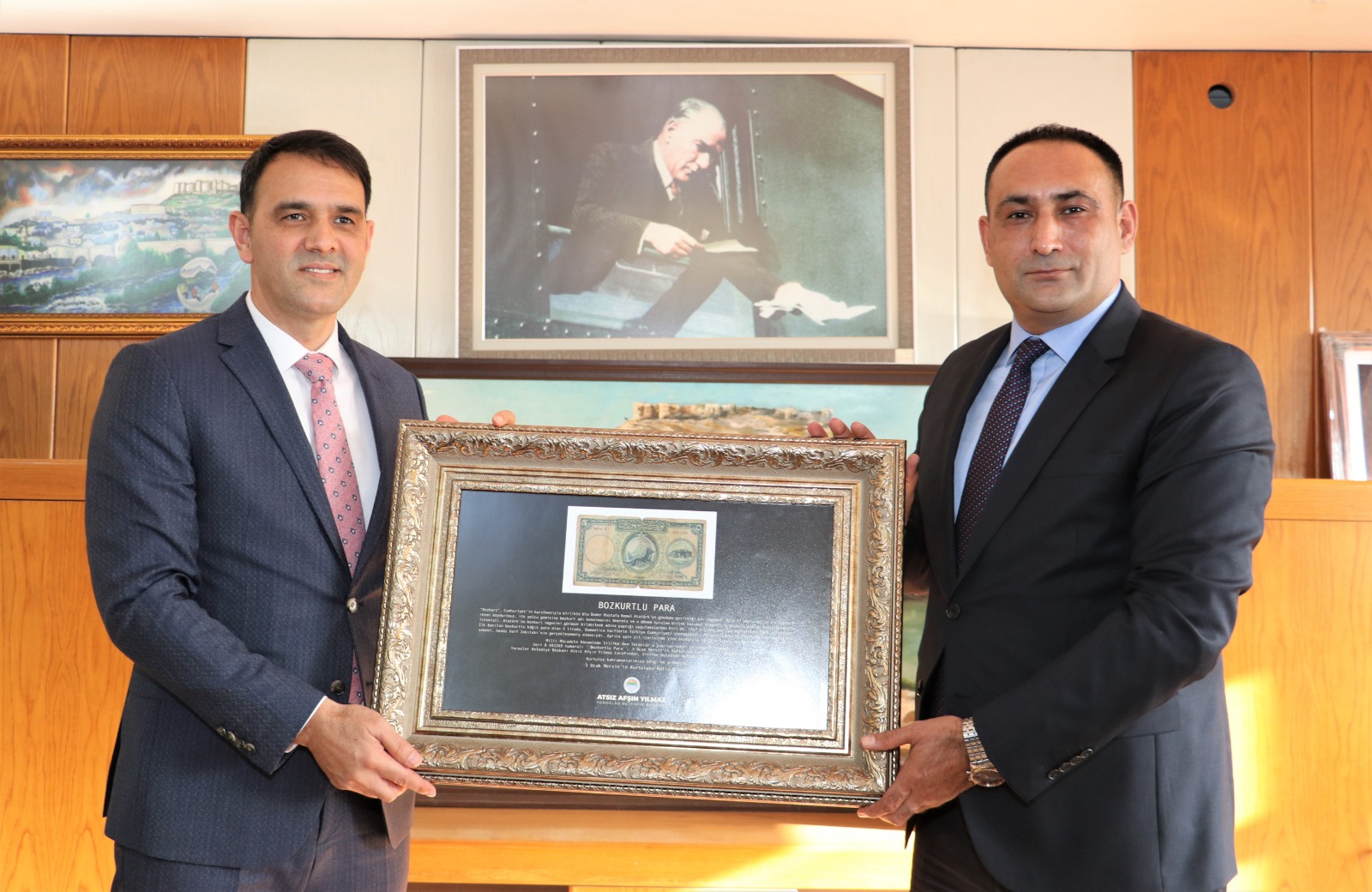 Toroslar Belediye Başkanı Atsız Afşın Yılmaz, Milli mücadele döneminde Silifke’den Toroslar’a yapılan nakdi yardıma istinaden Ulu Önder Mustafa Kemal Atatürk’ün 1927’de bastırdığı ‘Bozkurtlu Paranın’ orijinalini Silifke Belediye Başkanvekili Sadık Altunok’a takdim etti.